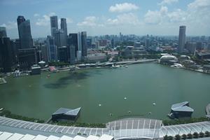 Marina Bay Sands ist ein Resort an der Marina Bay in Singapur, das von Las Vegas Sands erbaut und 2010 eröffnet wurde. Das 20 Hektar umfassende Resort wurde von Moshe Safdie Architects entworfen. Die Anlage besteht aus einem Casino, einem Hotel, einem Konferenz- und Ausstellungszentrum, einem Einkaufszentrum, einem Kunst- und Wissenschaftsmuseum, zwei Theatersälen, diversen Verpflegungsmöglichkeiten, Bars und Nachtclubs sowie zwei schwimmenden Pavillons. Die drei 55-stöckigen Hoteltürme tragen auf 191 Meter Höhe einen 340 Meter langen Dachgarten. Teil der größten öffentlichen Auslegerplattform ist ein 146 Meter langer Infinity Pool. Das Resort gilt als die teuerste alleinstehende Kasinoanlage der Welt. Die Grundstückkosten eingerechnet, soll der Bau acht Milliarden Singapur-Dollar (rund 4,6 Milliarden Euro) gekostet haben. |