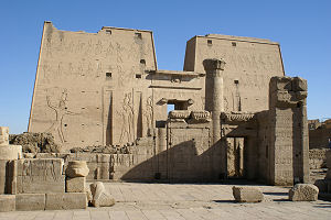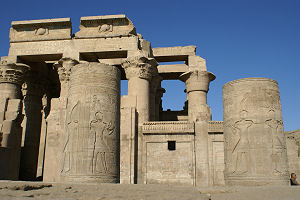 | Nach dem Frühstück ging mit einer Kutsche zum Tempel von Edfu, der dem Falkengott Houres gewidmet ist. Später legten wir ab und die Fahrt ging weiter nach Kom Ombo wo wir am Nachmittag den Tempel besichtigten. Er ist gemeinschaftlich dem Falkengott Haroeris Sobek, dem Krokodil, gewidmet und besitzt Heiligtümer. Spät am Abend erreichten wir Assuan. |