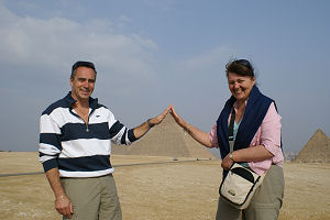 | Es war mal wieder früh aufstehen angesagt, denn unser Flug nach Kairo war bereits um 6.40 Uhr geplant. Nach dem wir unser Zimmer im Mövenpick Hotel "Pyramids" bezogen hatten in Gizeh nahe der Pyramiden, wurden wir um 11.00 Uhr abgeholt. Der Buss brachte uns zu der Stufenpyramide von Sakara. Bein anschliessenden Mittagessen wurden wir von einem Gewitter überrascht, was eher selten vor kommt in Aegypten. Na ja, muss man wohl auch mal erlebt haben in Kairo! Am Nachmittag, dann etwas vom eindruckvollsten, der Anblick der Pyramiden und Sphinx von Gizeh. Auch ist in zwischen unsere Gruppe wieder kleiner gewordne auf sechs Personen. |