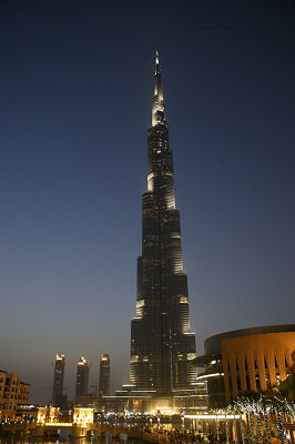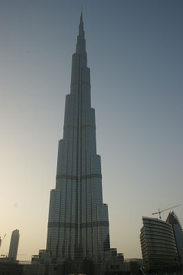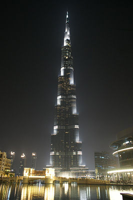 Der Burj Khalifa wurde von der Projektgesellschaft Emaar Properties nach Plänen des Architekten Adrian Smith gebaut. Er ist seit März 2008 das höchste Bauwerk der Welt, besitzt weltweit die meisten Stockwerke und auch das höchstgelegene nutzbare Stockwerk. Die Bauarbeiten begannen im Jahr 2004, im Januar 2009 wurde die Endhöhe von 828 Metern erreicht. Das Gebäude wurde am 4. Januar 2010 eingeweiht. Der Burj Khalifa ist mit 828 Metern Gebäudehöhe, 830 Metern bis Antennenspitze und 189 Stockwerken sowohl das höchste bis heute errichtete Gebäude als auch das höchste Bauwerk der Welt. Der Burj Khalifa ist das Gebäude mit der höchsten genutzten Etage, hat das höchste Dach und die dritthöchste Aussichtsplattform. Außerdem überragt der Burj Khalifa den Taipei 101 (509 m) als bisher höchstes Gebäude (Höhe der Gebäudestruktur), den Willis Tower (527 m) (ehemals: Sears Tower) als bisher absolut höchstes Gebäude (Höhe bis Antennenspitze) und den CN Tower (553 m) in Toronto als bisher höchstes nicht abgespanntes Bauwerk. Damit gehen die genannten Rekorde des höchsten Bauwerks zum ersten Mal seit Errichtung des Empire State Buildings 1931 wieder an ein Gebäude. Der Burj Khalifa ist zudem das welthöchste Gebäude, das auch zu Wohnzwecken genutzt wird. Am 17. Januar 2009 erreichte der Burj Khalifa seine Gebäudeendhöhe von 828 Meter. Die Gesamthöhe inkl. Geländer und Leuchtsignalanlage auf der Turmspitze beträgt 830 Meter. Damit lässt sich die Gebäudespitze bei klarer Sicht aus über 100 Kilometern Entfernung erkennen. Die Investoren hielten über lange Zeit, bis zur Eröffnung am 4. Januar 2010 sowohl die Höhe des Turms als auch die Anzahl der Stockwerke geheim. |