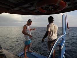Täglich fährt ein Boot um 17.00 Uhr zum Nachtfischen «für Touristen» zum nahegelegenen Riff. Die Fahrt dauert rund zehn Minuten. Kleine Instruktion und schon kann man sein Glück versuchen einen Fisch zu fangen. Ich konnte gleich der zwei fangen, welchen wir dann auch gleich wider die Freiheit gaben und sie zurück ins begaben. Auch andere hatten Erfolge zu vermelden. So nach Sonnenuntergang ging es dann wider zurück zur Insel. Dieser kleine Ausflug ist für einmal im All Inklusive Packet inbegriffen. Every evening a boat leaves at 5:00pm to take visitors fishing on the nearby reef. It takes about 10 minutes to reach the fishing point. After a short demonstration everyone can try their luck at catching a fish. Rene managed to hook two which after a short inspection got the chance to swim another day. After watching the sunset the boat returns to the Island. |
