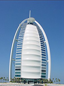 Der Burj al Arab (Arabien Tower) ist mit seinen 321 Metern Höhe das höchste, teuerste und auch das einzige sieben Sterne Suitenhotel der Welt.