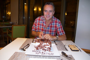 | „Happy Birthday René“ Today Rene celebrated his 50th birthday. As usual we had a full program planned. After breakfast we again drove through the middle of Amman and headed east. After about 30 miles we reached the dessert castle of Qasr al-Kharan and about 8 miles on that of Qusair Amran. These are fairly well preserved and definately worth a look. We had to drive back the sameway otherwise we would have landed in Iraq. Later we drove to Mount Nebo near Madaba. Here Moses is supposed to be buried. From this mountain there are some lovely views over the Jordan Valley over to Israel and the Dead Sea. We visited a Mosaic workshop where we could watch mosaic pictures being made by hand from local stone. We reached our hotel and the lowest reachable point on the earth – the Dead Sea – late afternoon. Here we were at 1363 feet below sea level! The reception warmly greeted us and surprised Rene by wishing him a happy birthday. Little did he know that I had organised a cake for after Dinner and Fabienne from Kuoni had organised an upgrade room. We had a lovely room with a large balcony and a good view. We just had to try out the Dead Sea and it really is quite an amazing experience – it’s impossible to sink and almost impossible to stand up to get out of the water! However it’s too salty and not recommended to stay in too long so we retreated to the hotel pool and enjoyed a long drink at the pool bar. |