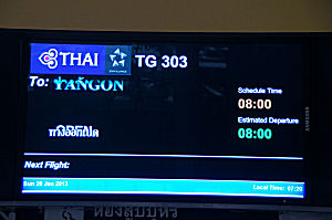 Auf dem Flughafen in Zürich herrschte Winter. Nach dem uns Dani, unser Nachbar, nach Zürich brachte, gingen wir zum Check In. Da unser Flugzeug erst mal vom Eis befreit werden musste, starteten wir mit rund einer Stunde Verspätung mit der Thai Airways nach Bangkok. Ein zwei Filme und dann etwas schlaf auf dem knapp zehn stündigen Flug. At Zurich airport it was deep winter. After Dani (our neighbour) dropped us off at the airport we checked in without problems directly to Yangon. We unfortunately left 1 hour 15 minutes late due to deicing. Fortunately with a good wind the captain managed to make most of this up and we landed at 6:15 in Bangkok. After walking through most of Bangkok airport for our transfer flight to Yangon we then sat in a bus that took us back to where we had started from! Morning fitness! |