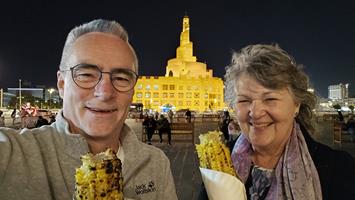Um neun Uhr wurden wir wiederum von einem Guide abgeholt und fuhren in den Westen nach Zekreet. Auf dem Weg hielten wir bei einer Camel Race. Hier gab es hunderte von Kamelen zu bestaunen und es fand auch gleich ein Kamelrennen statt. Später erreichten wir Zekreet und die Wüste. Die Landschaft war atemberaubend mit dem Brooq Rock, Hohl in Rock, den Pilzhügeln und der Richard Serra Skulptur. Es war beeindruckend und es war menschenleer. Keine Seele weit und breit zu sehen. Diese tolle Gegend hatten wir für uns alleine. Auf dem Rückweg bewunderten wir noch eine spezielle Mosche, welche schief gebaut wurde. Gegen zwei Uhr waren wir zurück im Hotel. Später fuhren wir noch zum höchsten Gebäude von Qatar dem Torch Tower mit einer Höhe von rund 300m. Mit dem Lift fuhren wir so hoch es ging und genossen die Aussicht. Gegen Abend zum letzten Mal zum Souq Waqif. |