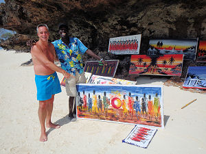 Die Hotelanlage Hideaway of Nungwi hatte auch noch anderes zu bieten als nur Liegestühle und einen gross Pool mit Aussicht aufs Meer. Am Hotelstrand gab es Liegen und eine kleine Bar um sich was Erfrischendes zu holen oder zu bringen. Es gab auch ein Sportangebot wie Windsurfen, Tauchen oder auch eine Fahrt mit dem Katamaran. Da das Surfen nicht mein Ding war, fuhr ich mit dem Katamaran aufs offene Meer bei gutem Wind. Es gab ein grosses Fitnesscenter mit Spa und einen Jacuzzi im Freien. Hier konnte man was für den Körper tun. Ehrlich gesagt, beliessen wir es beim Jacuzzi. Das Frühstück und Mittagessen war immer im Buffetrestaurant. Man konnte sich auch jederzeit was von der Karte bestellen und an den Liegestuhl bringen lassen. Wenn man am Strand in Richtung Nungwi ging, kam man beim einen oder anderen Strandhändler vorbei. Sie boten Souvenirs, Tücher und Malereien an. Wichtig war hier, dass man zu Handeln beginnt. Wollte einer nicht, so ging man ein paar Schritte weiter zu seinem Kollegen. Unterwegs gibt es auch vereinzelte Strandbeitzli um was zu trinken, denn auch wenn der Wind ging war es schon ziemlich heiss. So gegen Abend begaben wir uns zur Bar, gönnten uns einen, zwei….. Drinks und hofften auf einen schönen Sonnenuntergang. Vielfach gab es gegen Abend zu viele Wolken für einen perfekten Sonnenuntergang. Danach machten wir und frisch für den Abend und das Nachtessen. Es gab ein Buffetrestaurant, ein Fleischrestarant und ein japanische Restaurant. Zweimal die Woche wurde ein grosses Buffet im freien gemacht unter dem Sternenhimmel. Am Abend gab es zum Teil auch etwas Unterhaltung von den Inselbewohner. The hotel Hideaway of Nungwi offers not only sunbeds by the pool. The hotel beach also has sunbeds and a bar. They also offer windsurfing, diving, and snorkelling and catamaran trips. There is also a large fitness studio and a spa with Jacuzzi and steam room (!). Breakfast and Lunch was always a buffet in the Aqua Restaurant. Dinner is either buffet or there is a Japanese Restaurant and a Grill Restaurant. Twice a week there is an outside buffet. On the beach you can also buy paintings, t-shirts and sarongs. There are also several beach bars which is good as, despite the wind, it can get very hot. It’s important to barter. Each evening we had a drink in the bar hoping for a sunset – unfortunately the clouds seem to come at dusk so we never saw the sun sink into the sea. |