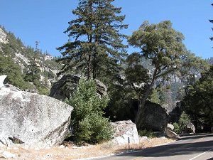 | Heute war ein langer Weg auf dem Programm zum Yosemetie Natioalpark, was hiess, dass um 05.00 Uhr Tagwache war. Wir fuhren Richtung Osten Merced und Mariposa. In den Bergen von Mariposa verdunkelte sich der Himmel, wass man schon Meilen weit sehen konnte, und es roch verbrannt, es herrsche ein Waldbrand. Weiter ging es dann zum Yosemetie NP. Es ist eine schöne Natur mit grossen Felsen, doch der berühmte Wasserfall hatte kein Wasser wegen der Trockenheit. Weiter südlich im Mariposa Grove konnten wir bereits die ersten Sequoiabäume sehen. Dieser Tag endete dann im Motel"6" in Fresno. Today we had a long trip to Yosemite National Park which meant getting up at 05:00. We drove eastwards to Merced and Mariposa. In the mountains near Mariposa the sky turned dark – which we could see miles away – and smelt of smoke – Forest Fire!! We travelled further to Yosemite NP which is wonderful countryside with high cliffs and a well known waterfall which was unfortunately bone dry. Further south im Mariposa Grove we saw the first Sequoia trees. We finished the day in a Motel 6 in Fresno. |