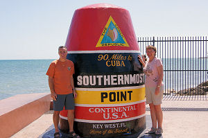 | Es ist wieder ein wunderschöner Tag angebrochen. Wir machten unser Auto startklar, tankten voll und fuhren los in Richtung Key West, dem südlichsten Punkt der USA. Die Strecke über die Key’s von Key Largo aus ist rund 150 Kilometer und führt über viele Inseln und Brücken. Es hat sich sehr viel verändert, als ich das letzte Mal vor knapp zwanzig Jahren hier war. Es war eine lange aber sehr schöne Fahrt. Nach dem Mittag erreichten wir unser Motel in Key West. Anschliessend parkten wir unser Auto in einem Parkhaus und gingen weiter zu Fuss nach Down Town. Es ist wirklich eine schöne und belebt Stadt. Natürlich mussten wir auch zum südlichsten Punkt. Um ein Foto zu machen konnte man kurz anstehen und einen Touristen frage ob er kurz abdrücken würde. So gegen Abend begaben wir uns zum Sunset-Pier, bestellten eine Kleinigkeit zum Picken und zum Trinken und genossen einen romantischen Sonnenuntergang. |