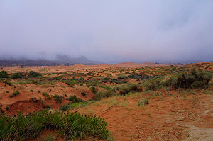 | Wie am Vorabend befürchtet, regnete es am Morgen wie aus Kübeln.Auch die Temperaturen sind nicht mehr so heiss wie auch schon. Aus diesem Grund mussten wir unsere Route etwas ändern. Ursprünglich wollten wir von Kanab aus durch den Cottonwood Canyon fahren. Wegen des anhaltenden Regens wurde diese nicht asphaltierte Strasse geschlossen. Wir fuhren kurz bei den Coral Pink Sand Dunes vorbei, was auch seinen Reitz hatte bei Regen. Weiter ging es durch den Red Canyon und vorbei am Bryce Canyon. Den hatten wir schon im 2004 gesehen. Weiter fuhren wir den Scenic Drive 12 nach Escalante und weiter nach Torrey beim Capitol Reef. Da auf dem Hochplateau gibt viel zu sehen. Als wir dann im Capitol Reef ankamen meinte es das Wetter gut mit uns und es begann die Sonne zu scheinen. Hoffen wir, dass der nächste Tag wieder etwas freundlicher beginnt als der heutige. |