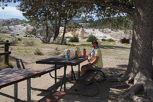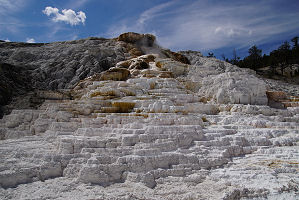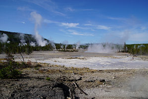 Vom nächtlichen Gewitter war nichts mehr zu sehen. Hier auf rund 2000m Höhe ist es gerade mal 1 Grad plus. Nach dem Frühstück fuhren wir wieder zum Westeingang des Yellowstone NP. Dieses Mal ging es in Richtung Norden. Entlang des Madison River. Die Stimmung war einzigartig, da zum Teil noch der Nebel in den Tälern hing. Doch der hat sich schnell verzogen. Unser erster Halt war Norris, wo sich die meisten Geysire befanden. Es rauchte und blubberte überall und der Schwefelgeruch hing auch in der Luft. Weiter nördlich war dann Mammoth Hot Springs. Hier waren wir auf rund 2400m und dies bei 21 Grad. Natürlich gab es was zum Mittagessen im Freien. Von hier aus waren es noch rund fünf Meilen bis zum Nordeingang. Hier steht der Roosevelt Arch. Im Verlaufe des Nachmittags ging es dann auf der Ost Route Richtung Südeingang mit ein paar Stopps und weiter durch den Grand Teton NP. Rund acht Meilen westlich erreichen wir den kleinen Ort Moran. Hier hatten wir unsere Unterkunft auf einer Ranch. Zum Nachtessen gab es Spare Ribs, mmhhhh…. war das fein. Zum Ausklang des Tages gab es noch Country Music mit Tanz. Ich habe mich da eher an die Musik gehalten. When we woke this morning the storm had blown over and we could look forward to another lovely day. It was cold – West Yellowstone lies at 2000m and it was 1C plus. It however soon warmed up. After breakfast we entered Yellowstone Park again at the west gate. The early morning mist was still hanging which added to the atmosphere. We headed north along the Madison River. Our first stop was Norris where most of the geysers are. It smoked and bubbled all over and there was a strong sulphur smell in the air. Further north we visited Mammoth Hot Springs with its strange calcium formations. By this time we had climbed to 2400m and it was 21C! Here we had a picnic lunch. From here it was just 5 miles to the north entrance where the Roosevelt Arch stands at the entrance. In the afternoon we headed south again through the rest of the park making occasional stops to admire the scenery. Finally we drove through Grand Teton Park. About eight miles west we came to the small town of Moran where we spent the night on a ranch. We had a dinner of very tasty and tender spare ribs. The evening was completed with some country dancing – although we only watched. |