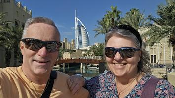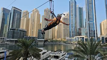 The next day we drove back to Dubai for the next few days. After being out of service for the past few years, the world's largest Ferris wheel, with a diameter of 250 meters, recently reopened. We booked tickets online. One trip around took about 45 minutes. The view of Dubai Marina and the Palm was fantastic. The next day we visited The Museum of the Future. You have to book tickets online well in advance. On our last visit to Dubai, we were unable to get tickets on site. It was very interesting and ingeniously done with all of today's technological possibilities. You should definitely see this when you are in Dubai. The next day was my personal highlight. After doing the Skywalk at 219 during my last stay in Dubai, it was now time for the next challenge. Because of the rain in the morning, this mission almost seemed to fail. The weather was kind and after an hour's delay, the time had come. I was able to start the ZipLine adventure. From the assembly point, we took a minibus - about eight of us - to a high-rise building in the Marina. We took the elevator to the top floor, then climbed a few more stairs to the roof. We were about 171 meters up and had a fantastic view of the Marina and the Ain Dubai Ferris wheel. We were given instructions, everything was prepared, and the GoPro cameras were set up. Cameras on, a few questions and answers, before it was time to get started. One by one, until it was my turn. I was strapped in and secured. Then the one-kilometer ride on the cable began, at about 80 km/h, down into Dubai Marina. Carol waited for me to arrive so she could take a photo or two. It was a fantastic feeling. I was able to really enjoy the experience, even though it only lasted a minute. The next day, I received two emails asking me to download the videos. It was cool...