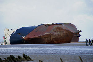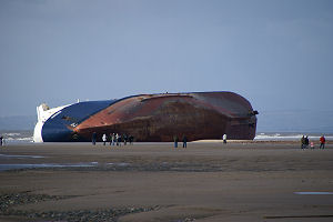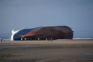 Fähre in Irischer See evakuiert und vor Blackpool gestrandet (01.02.08) Die Fähre „Riverdance“ (IMO. 7635361), 1599 BRZ, funkte am 31.1. um 19.43 Uhr Mayday, nachdem sie acht Meilen westlich von Fleetwood, Lancashire, von einer Freak-Welle getroffen worden war. Auf der 3046 Tonnen verdrängenden “Riverdance“, die im Rahmen ihres Linienverkehrs von Warrenpoint in County Down nach Heysham in Lancashire unterwegs war, ging anschließend die Ladung über, so dass sie bis zu 60 Grad Backbordschlagseite entwickelte. Die losgerissene Ladung aus Trucks und Trailern bewegte sich im Laderaum und sorgte so für eine stete Destabilisierung. Zwei RAF-Hubschrauber und einer der Coastguard aus Dublin flogen zu der Fähre, die von sieben Meter hohen Wellen getroffen wurde. Der Wind kam mit bis zu 10 Bf mit Windgeschwindigkeiten bis zu 96 km/h aus Nordwest. Die Fähre trieb derweil wenige Meilen vor dem Strand des Seebades Blackpool und legte sich dort auf die Steuerbordseite. Die 10 Mann Besatzung und die vier Passagiere, die sich ab 21 Uhr auf der hochliegenden Steuerbordseite versammelt hatten, wurden jeweils zu zweit aus der Luft evakuiert und zum Blackpool Airport geflogen. Acht barg die RAF, die restlichen die Küstenwache. Einige hatten leichte Verletzungen erlitten, zwei wurden vorsorglich ins Blackpool Victoria Hospital gebracht, insgesamt aber waren alle Geretteten wohlauf. Neun der Besatzungsmitglieder waren noch an Bord gewesen, als die Fähre am Nordstrand auf Grund lief. Sie waren in der Hoffnung, das Schiff noch retten zu können, zunächst an Bord geblieben und wollten Ballastwasser aufnehmen, um den Havaristen auf Grund zu stabilisieren. Die Bedingungen waren dann aber dadurch, dass sich das gestrandete Schiff mit Hochwasser breitseits zur Brandung drehte, so schlecht geworden, dass der Kapitän auch um deren Abbergung bat. Sie fand durch den in Blackpool auf Standby befindlichen Hubschrauber RAF 122 statt. Beteiligt an der gesamten Rettungsaktion waren auch der Tanker “Steersman”, der bei der Kommunikation assistierten, und die beiden Offshore-Versorger „Clwyd Supporter“ und „Highland Sprite“. Das Schiff hat rund 150 Tonnen Treibstoff in den Bunkern. |