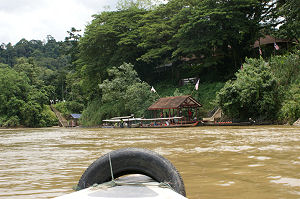 | Am Morgen erkundigten wir uns noch nach dem genauen Weg in den Regenwald National-Park Taman Negara. Die Fahrt dauerte knapp vier Stunden bis wir Kuala Tahan erreichten. Die Strassen waren recht gut, ob schon es den einen oder anderen Abschnitt gab der etwas eng und auch sehr kurvig war. Auch bekamen wir schon die ersten Affen zu sehen, welch sich da am Strassenrand aufhielten. In Kuala Tahan angekommen, hiess es erst mal das Gepäck zum Boot zu bringen, welches uns dann zur Hotelanlage “Mutiara Taman Negara Resort” brachte. Das Wetter war bewölkt und sehr warm. Die Kleider waren nass, so dass man sie ausdrehen konnte. Wir bezogen unser Chalet im Dschungel und machten uns auf Entdeckungsreise. Nach kurzer Zeit machten wir Bekanntschaft mit mindestens zehn Affen die sich hier herumtrieben. Später gingen wir dann duschen um uns für das Nachtessen bereit zu machen. Was natürlich auch fast dazu gehörte ist der tropische Regen, welcher aber nicht lange anhielt! After asking for directions to the National Park which we got in minute details! We headed off and 4 hours later we reached Kuala Tahan. The roads are fairly good although quite twisting and full of lorries. On the way we saw our first monkeys playing on the road side! We parked the car in Kuala Tahan and unloaded our bags for the boat trip across the river - this is the only way into the Rain Forest. On the other side our bags were hoisted up on a trolley system while we climbed the steep stairs. Our hotel Mutiara Taman Negara Resort was just at the river crossing so we hadn’t far to go to check in. After finding our room we walked around the hotel grounds where we soon found more monkeys in the trees. After showering and changing we headed off for dinner and more tropical rain storms which don’t last long but are very heavy. |