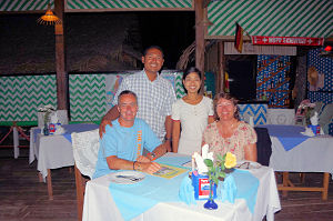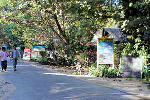 Wie bereits schon erwähnt, sind wir meistens für das Mittag- und Abendessen auswärts gegangen. Das Essen im Hotel ist gut aber im Verhältnis sehr teuer. Nur ein paar Schritte hinter dem Hotel gibt es rund fünf kleine Restaurants. Hier ist das Essen sehr gut und sehr preiswert. Man muss auch gerne Fisch haben, denn Pork und Chicken gibt es nur sehr spärlich. Wir waren im Mingalarba und im Tonys Family Restaurant. Unser Favorit war Tonys, denn es ist familiärer und auch sehr persönlich. Er selber spricht mit den Gästen (englisch) und kennt die Leute wenn sie wieder kommen. Mit ihm haben auch den Elefantenausflug unternommen. Auch hat er mir auf meinen USB-Stick einiges an einheimischer Musik mit nach Hause gegeben. Am Mittag und zum abendlichen Apero, sind wir meistens zum Strandbeizli „Sea Lady“ gegangen, dass nur gerade fünf Minuten vom Hotel entfern war. In den Restaurants kann man für rund sFr. 12.- zwei Menü bestellen eine Flasche Bier und zum Bier gibt es immer Erdnüsse dazu. Eine Büchse Cole kosten rund 1.20. und im Hotel 4.80!!! Nur noch zum Vergleich, so haben wir in Mandalay und in Yangon für denselben Preis zu dritt oder auch zu viert gegessen. Am Strand zum Beispiel, bei den Früchteverkäuferinnen kann man fünf Bananen habe für gerade mal sFr. 0.60, also ist dies schon fast geschenkt. Was aber alles übertraf, war der Myanmar Rum. Im Hotel kostete ein kleiner Schluck sFr. 2.40 und im Laden eine 7 dl Flache gerade mal sFr. 1.80. Natürlich nahmen wir eine mit nach Hause:-) Most lunch times and evenings we went to a restaurant outside the hotel. The hotel has a good restaurant but in comparison to the other restaurants relatively expensive. Just across the road there are 5 small restaurants – very good and very reasonably priced. As we were at the coast fish and seafood was the main part of all the menus with occasionally chicken and very occasionally pork. We ate at Mingalabar and Tony’s Family restaurant our favourite being Tony’s. It is run by the whole family – Tony being the son in law! Tony also took us on the elephant trip. Our sunset drink we had mainly on the beach at the Sea Lady restaurant. A meal for two costs us around £8 with drinks. Inland we could eat for 3 or 4 people for this price. What amazed us was the beer prices. In the shops a bottle costs 1200 Kyat. In most restaurants 2000 and in the hotels up to 8000!! We bought 5 bananas on the beach for about 40p. There is a Myanmar rum that costs 1500 Kyat for 700 ml which the hotels charge at least 2000 for a very small glass! |
