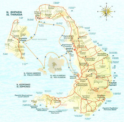 Santorin (neugriechisch Σαντορίνη (f. sg), Sandorini, meist Santorini transkribiert, von italienisch Santa Irene) ist der Name eines kleinen Archipels im Süden der Kykladen sowie von dessen Hauptinsel, die im Griechischen zumeist Thira (griechisch Θήρα (f. sg), nach Transkription aus dem Altgriechischen auch Thera ‚die Wilde‘) genannt wird. Santorin wurde 2001 von etwa 13.400 Einwohnern bewohnt. Seit der Verwaltungsreform 2010 ist es unter dem Namen Thira gleichzeitig eine Gemeinde (griechisch dimos) in der Region Südliche Ägäis. Die Santorin-Inselgruppe liegt im südlichen Ägäischen Meer etwa 120 km nördlich von Kreta. Die nächstgelegenen Inseln sind Anafi 22 km östlich und Ios 19 km nördlich; Milos liegt etwa 77 km nordwestlich. Die ringförmig angeordneten Inseln Thira, Thirasia und Aspronisi bilden den Rand einer vom Meer gefluteten Caldera, in deren Zentrum die Inseln Palea Kameni und Nea Kameni liegen. Das gesamte Archipel hat einen Durchmesser von etwa 16 km. Die Gesamtfläche beträgt rund 92,5 km². Aufgrund der geologischen Entwicklung gehören auch die Christiana-Inseln und der Unterwasservulkan Kolumbos zum Santorin-Archipel. Von der 150 bis 350 m hohen Caldera-Wand ist die Abdachung von Thira und Thirasia nach außen hin sanft. Lediglich im Südosten von Thira unterbricht das Profitis Ilias-Massiv, mit 567 m die höchste Erhebung des Archipels, diesen sanften Abfall. Vielerorts bildet ein breiter schwarzer Lavastrand den Übergang zum Meer. An anderen Stellen reicht die Bimsdecke bis ans Meer und bildet dann Steilküsten. Auf Thira mit Ausnahme des Profitis Ilias-Massivs und auf Thirasia prägen tiefe Erosionsrinnen in der weichen Bimsdecke, verursacht durch winterliche Regenfälle, die Topographie. Die maximale Ausdehnung der sichelförmigen Hauptinsel Thira beträgt vom Kap Mavropetra (Ακρωτήριο Μαυρόπετρα) im Norden bis zum Kap Exomitis (Ακρωτήριο Εξωμύτης) im Süden 17,4 km. Die Breite variiert zwischen 1,2 km im Norden bis etwa 6 km im Süden. Etwa 70% der Inselfläche ist von teilweise massiven Bimssteinschichten bedeckt. Im Norden werden diese Schichten von älteren Vulkanen, im Süden von älteren Lavadomen unterbrochen. Jeweils 15% entfallen auf Lava und Schlacken sowie auf das metamorphe Grundgebirge. Die Caldera von Santorin umfasst eine Fläche von etwa 84,5 km², die Ausdehnung beträgt in Nord-Süd-Richtung etwa 11 km, in West-Ost-Richtung fast 8 km. Die absolute Höhe beträgt im Norden von Thira vom Meeresgrund etwa 700 m. Der Caldera-Boden besteht aus vier Teilbecken. Das nordöstliche Teilbecken erreicht eine Tiefe von nahezu 400 m und wurde vermutlich mit den Vorgängen der Minoischen Eruption gebildet.