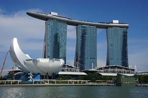 Marina Bay Sands ist ein Resort an der Marina Bay in Singapur, das von Las Vegas Sands erbaut und 2010 eröffnet wurde. Das 20 Hektar umfassende Resort wurde von Moshe Safdie Architects entworfen. Die Anlage besteht aus einem Casino, einem Hotel, einem Konferenz- und Ausstellungszentrum, einem Einkaufszentrum, einem Kunst- und Wissenschaftsmuseum, zwei Theatersälen, diversen Verpflegungsmöglichkeiten, Bars und Nachtclubs sowie zwei schwimmenden Pavillons. Die drei 55-stöckigen Hoteltürme tragen auf 191 Meter Höhe einen 340 Meter langen Dachgarten. Teil der größten öffentlichen Auslegerplattform ist ein 146 Meter langer Infinity Pool. Das Resort gilt als die teuerste alleinstehende Kasinoanlage der Welt. Die Grundstückkosten eingerechnet, soll der Bau acht Milliarden Singapur-Dollar (rund 4,6 Milliarden Euro) gekostet haben. |