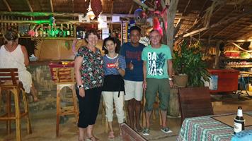 Diese tollen Ferien gingen langsam dem Ende entgegen. Am vorletzten Tag machten wir noch einen kurzen Abstecher zur wunderschönen Coconut Beach. Sie ist mit dem Taxi etwas in 25 Minuten zu erreichen. Uns brachte wieder Bamboo von der Bar nebenan dorthin. Wir unternahmen einen Spaziergang genossen den weissen feinen Sand unter unseren Füssen - einfach traumhaft. Anschliessend fuhren wir zurück zum Hotel und liessen uns in unsere Liegestühle fallen und genossen einen prächtigen Sonnenuntergang, welcher übrigens um etwas 18.35 Uhr war. Heute war Valentinstag und wir gingen zu Bamboo zum Nachtessen. Da bestellten wir uns einen Red Snapper Fisch, frisch zubereitet vom Grill. Mmhhh…. war das fein. This wonderful holiday is fast approaching its end. On the last but one day we took a short taxi ride to Coconut Beach. It took us about 25 minutes to get there. Our taxi driver was again Bamboo from the bar next to the hotel. We walked along the wonderful white sands - delightful. Later we returned to the hotel and spent the afternoon on our sunbeds until the sun went down at 6.35pm. For dinner we went to Bamboo’s bar and enjoyed a grilled Red snapper for our Valentine's Day Dinner. It was delicious. |
