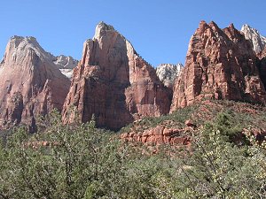 | Auch heute geniessen wir einen wolkenlosen Himmel wie schon die ganze Woche bei ca. 30 Grad. In den Bergen hatten um 20 und in Las Vegas bis zu 40 Grad. Auf dem Interstate 15 fuhren wir in östlicher Richtung in den Bundesstaat Utah, wo wir gegen Mittag im Zion Nationalpark ankamen. Der Zion NP beeindruckt durch die vielen Farben und Schluchten. Zuerst machten wir mit dem Buss eine 90 minütige Fahrt in den Canyon, schossen unser Fotos und staunten. Später durchquerten wir den Canyon noch mit dem eigenen Auto und fuhren weiter nördlich nach Cedar City, wo wir unser Motel"6" aufsuchten. The weather so far has been fantastic, blue skies and tempreatures around 30C. (In the mountains it was just above 20C and in Las Vegas 40C). On the Interstate 15 we drove east to Utah , where we arrived towards lunch time at Zion National Park . Zion NP is impressive with its many colours and valleys. First we took the 90 minute bus trip into the canyon, took our photos and were totally amazed. Later we crossed the park in the car northwards to Cedar City and our next Motel 6. |