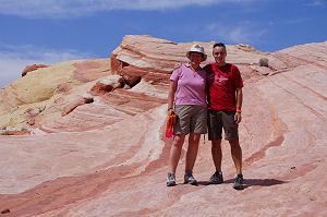 Unser Ziel war heute Kanab. Von Las Vegas aus fuhren wir Richtung Norden, Nach etwa 56 Meilen erreichten wir den Eingang zum etwas weniger bekannten Valley of Fire. Der Eintritt kostete 10 Dollar und man konnte mit dem Auto die schönsten Punkte anfahren. Besonders eindrücklich war die „Fire Wave“. Vom Parkplatz aus waren es etwa 30 Minuten zu laufen, was ja eigentlich nicht viel war, doch bei 38 Grad sah dies doch etwas anders aus. Bewaffnet mit Fotoapparat, genügend Trinken und gutem Schuhwerk war auch dies zu machen. Es hat sich auf jeden Fall gelohnt. Später auf dem Weg nach Kanab verdunkelte sich der Himmel etwas und am Horizont sahen wir die ersten Gewitter. Was das für den nächsten Tag bedeuten, werden wir dann sehen. Ob es die Hitze war oder das Essen, Rene hatte eine leichte Magenverstimmung, was sich dann auch wieder legte. Today we left Las Vegas towards Kanab – our overnight stop. We drove north along the highway for about 56 miles where we reached the not so well known Valley of Fire. The first national Park opened in 1936. They had 9,000 visitors in the opening year and today about 200,000 – compared to Grand Canyon that has over 5 million visitors each year! Entry fee is $10 and we could drive near to the best points. The mouse hole is a pool that collects the rain water and holds it for several months. The Wave of Fire is about 2km round trail through some amazing scenery ending with some spectacularly coloured rock formations. After spending the morning in the Park we headed back onto the highway and Kanab. Dinner we enjoyed in a typical American Diner then headed off to bed.