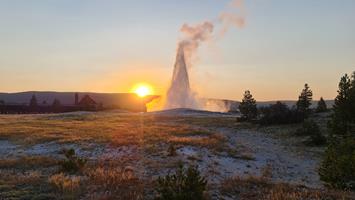 Heute gingen wir früh los, denn auf uns wartet der erste richtige Höhepunkt unserer Reise der Yellowstone NP. Erst machten wir einen kurzen Stopp in Jackson und weiter zum Grand Teton NP. Das Wetter zeigte sich weiter von seiner besten Seite. Beim Parkeingang waren wir dann schon etwas erstaunt, denn wir rechneten mit viel mehr Touristen und Autos. Dies konnte uns nur recht sein. Gegen Mittag erreichten wir unsere Unterkunft unmittelbar beim bekannten Old Faithful Geysir. Es ist der Lieblingspark von Carol. Wir schnürten unsere Schuhe und machten uns auf den Weg im Park, wo es viel zu sehen gab. Der Geysir machte sich etwa immer alle 90 Minuten bemerkbar. Jedes Mal ein faszinierendes Schauspiel. Wir hatten das Glück, dass der Geysir genau zum Sonnenuntergang ausbrach, was schon sehr speziell war. Nach einen eindrucksvollen Tag ging es dann zu unserer Lodge unweit des Geysirs. Today we started early, because the first real highlight of our trip, Yellowstone NP, was waiting for us. First we made a short stop in Jackson and then on to Grand Teton NP. The weather continued to show its best side. At the park entrance we were a bit surprised, because we expected a lot more tourists and cars. This could only be a good thing for us. Around noon we reached our accommodation right next to the famous Old Faithful Geyser. It is Carol's favourite park. We laced up our shoes and made our way around the park, where there was much to see. The geyser made its presence felt every 90 minutes or so. A fascinating spectacle every time. We were lucky that the geyser erupted right at sunset, which was very special. After an impressive day, we went to our lodge not far from the geyser. |